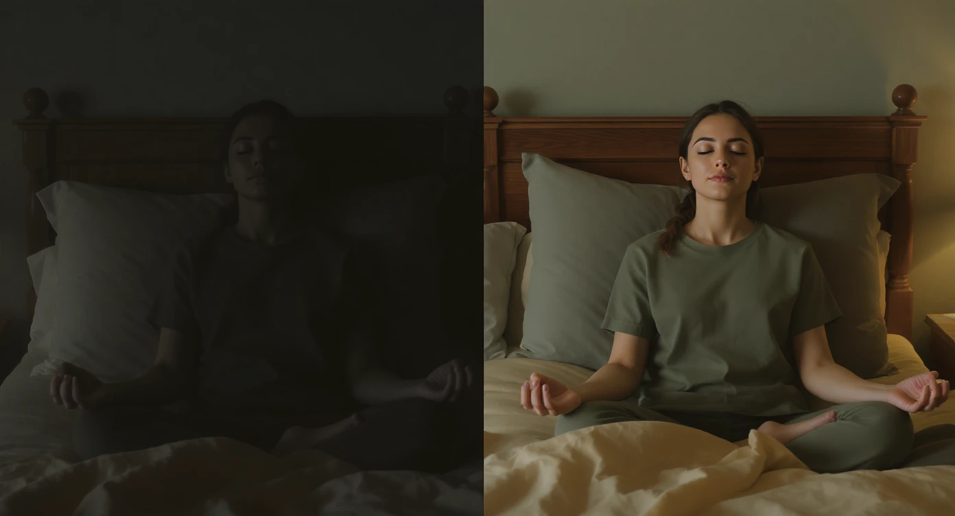 Аудио: Медленный, поддерживающий голос: «Я здесь. Сейчас. Это проходит.»